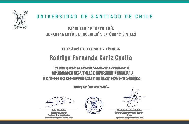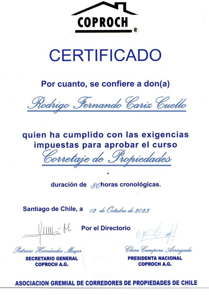 Liderando nuestro equipo está Rodrigo Cariz, Ingeniero y corredor de propiedades, quien cuenta con una sólida formación en ingeniería metalúrgica de la Universidad Católica del Norte y especializaciones en Dirección de Ventas (Universidad de Chile) y Desarrollo e Inversión Inmobiliaria (Universidad de Santiago). Con una trayectoria destacada en asesoría y consultoría técnico-comercial en mercados industriales chilenos e internacionales, Rodrigo aporta su experiencia y su enfoque analítico y creativo al servicio de nuestros clientes.